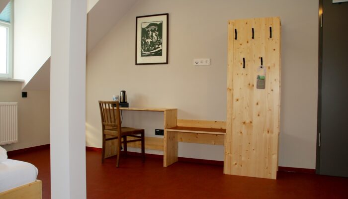 Das 26 m² große Zimmer mit Dachschrägen und hoher Fensterbrüstung (1,16 m) verfügt über ein Doppelbett 180 x 200 cm und eine Schlafcouch (180 x 200 cm). Damit bietet es Übernachtungsplätze für bis zu 4 Personen. Ein Kinderreisebett ist problemlos zustellbar. Zur Ausstattung gehören außerdem 2 Nachttische, Kofferablage, Garderobe, Schreibtisch und ein kleiner Wasserkocher.