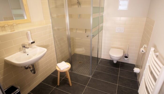 Das 5 m² große Bad hat eine bodengleiche Dusche.