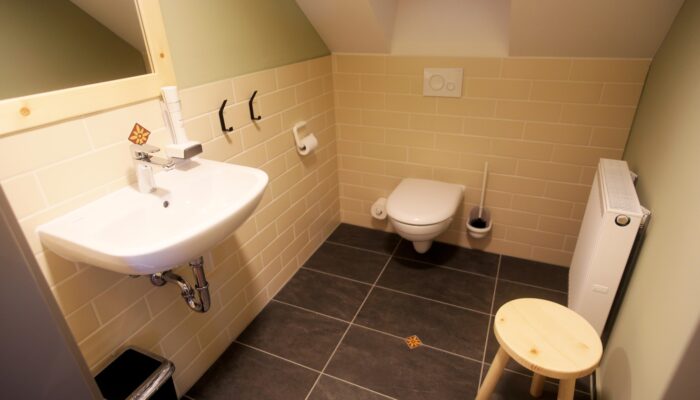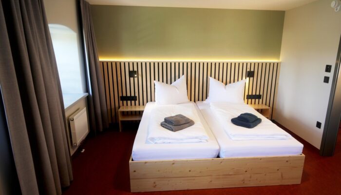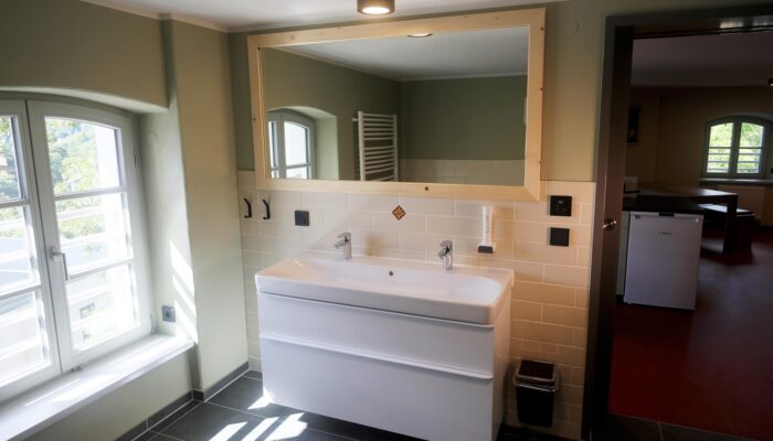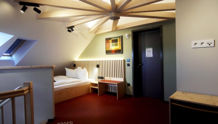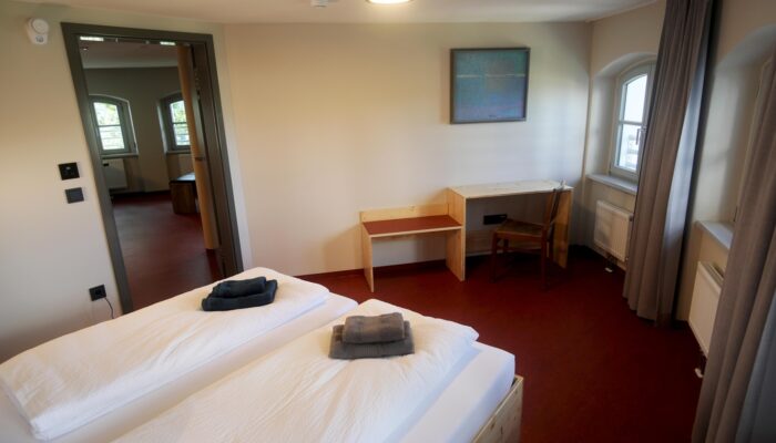 Die 65 m² große Maisonettewohnung im halbrunden Turm mit 2 Schlafzimmern bietet Platz für bis zu 6 Personen. Auf der unteren Ebene befinden sich ein geräumiger Küchen- und Wohnbereich mit einer Küchenzeile. Hier sind Kühlschrank, Induktionskochfeld, Spüle, Wasserkocher und Küchenzubehör vorhanden, außerdem ein großer Tisch mit Sitzgelegenheiten, eine Kommode und eine Garderobe. Im abgetrennten Schlafzimmer mit Doppelbett 180 x 200 cm und Nachttischen befinden sich zusätzlich ein Schreibtisch und eine Kofferablage. Ein Kinderreisebett ist problemlos zustellbar. Das 10 m² große Bad hat einen Doppelwaschtisch, Waschtischunterschrank und eine bodengleiche Dusche. Über eine Treppe ist die Spitze des historischen Wehrturms zu erreichen. Hier ist der „Kaiserstuhl“ sichtbar, der die Aufhängung des Turmdaches gewährleistet. Ein 160 x 200 cm großes Doppelbett mit Nachttisch und eine Schlafcouch (180 x 200 cm) bieten Schlafplätze für bis zu 4 Personen. Ein Schreibtisch und eine Kofferablage komplettieren dieses Turmzimmer. Außerdem ist ein separates kleines Bad mit WC und Waschbecken vorhanden.