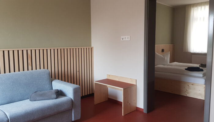 Unsere Juniorsuite hat ein 12 m² großes separates Schlafzimmer mit Doppelbett aus 2 Betten á 90 x 200 cm, die auch als Einzelbetten gestellt werden können. Im 24 m² großen Wohnraum befinden sich ein Tisch mit Hockern und eine Schlafcouch (180 x 200 cm), die bei Bedarf Schlafplätze für 2 Personen bietet. Ein Kinderreisebett ist problemlos zustellbar. Zur Suite gehören Kofferablage, Garderobe und ein kleiner Wasserkocher. Das 6 m² große Bad hat eine bodengleiche Dusche.