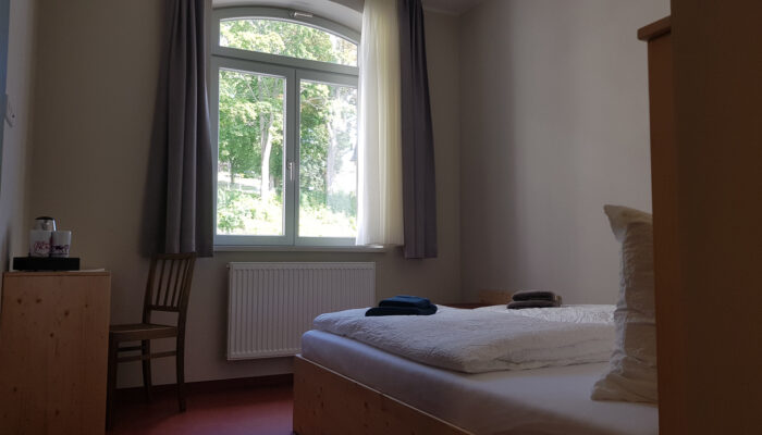 Unser ca. 11 m² kleines Zimmer eignet sich für Menschen, die sich gut kennen und mögen oder für Alleinreisende. Das Doppelbett von 160 x 200 cm hat 2 einzelne Matratzen. Im Zimmer befinden sich eine Kofferablage, Garderobe, Schreibtisch und ein kleiner Wasserkocher. Das 5 m² große Bad hat eine bodengleiche Dusche.